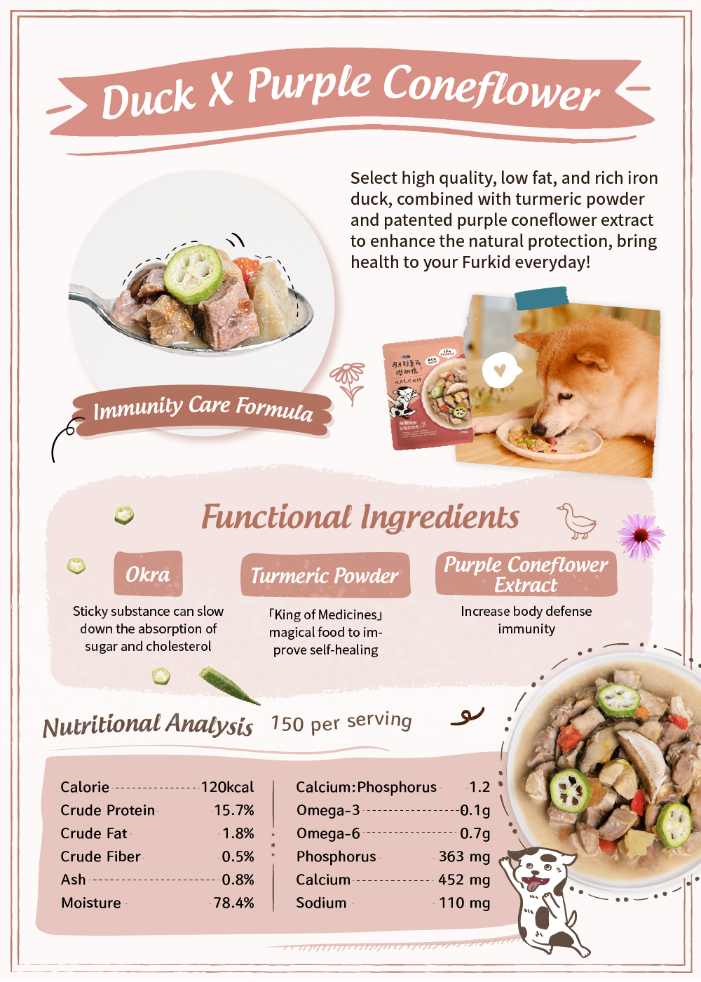 Duck, Chicken (Adjust the Ratio According to the Season), Duck Liver, Sweet Potato, Okra, Tomato, Shiitake Mushroom, Turmeric Powder, Multivitamins, Multiminerals, Patented Purple Coneflower Extract