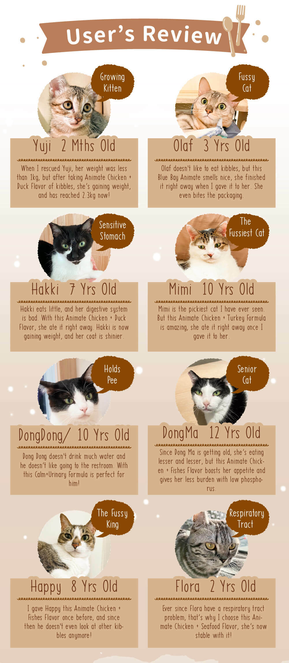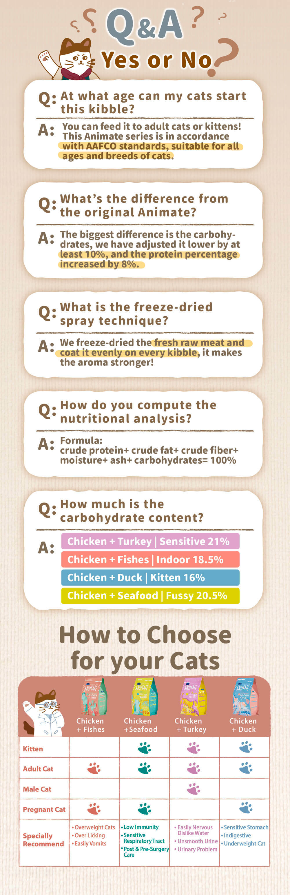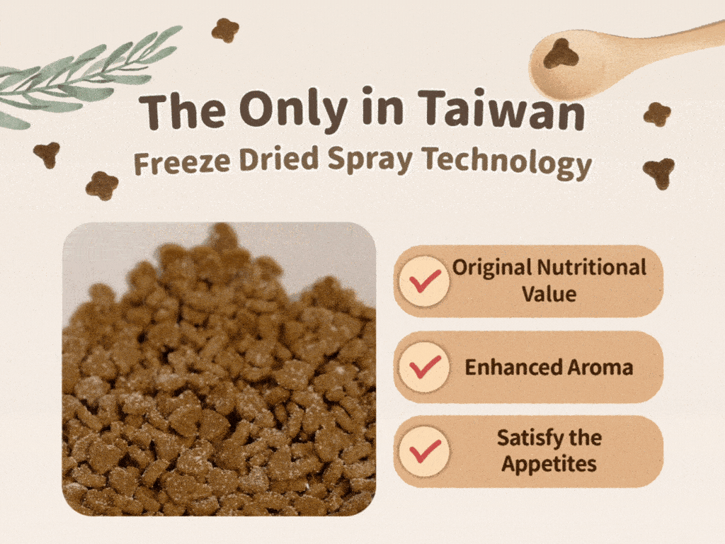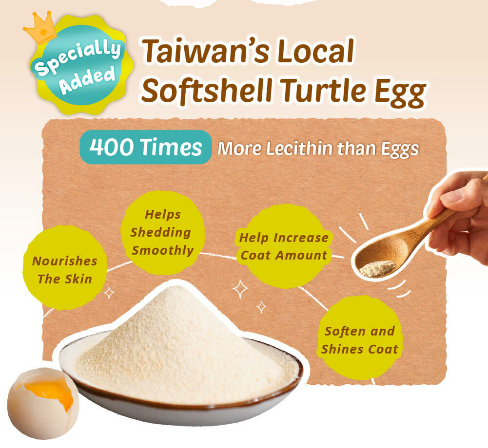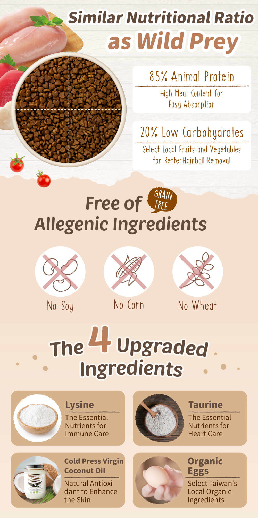 Dried Chicken, Mix Seafood (Tuna, Mackerel, Sardines, Snapper, Milkfish, Scallops), Pea, Chickpea, Fruit and Vegetable Dietary Fiber (Beet Fiber, Pumpkin, Barley, Yam, Cranberry, Tomato, Apple, Carrot, Black Fungus), Cassava Fiber, Vegetable Oil (Soybean Oil, Preserved Tocopherol), Cod Oil, Chicken Oil, Hydrolyzed Protein (Salmon), Organic Cold Press Virgin Coconut Oil, Organic Egg, Multiminerals (Dicalcium Phosphate, Potassium Chloride, Sodium Chloride, Amino Acid Chelated Iron, Amino Acid Chelated Zinc, Amino Acid Chelated Copper, Amino Acid Chelated Manganese, Potassium Iodide, Yeast Selenium), L-Lysine, Multivitamins (Choline Chloride, Vitamin A, Vitamin E, Vitamin C, Vitamin D3, Vitamin B1, Niacin, Calcium Pantothenate, Vitamin B6, Riboflavin, Folic Acid, Vitamin H, Vitamin B12), Yeast Powder (with MOS), Seaweed Powder (Fucoidan), Yucca Extract, Comprehensive Digestive Enzymes (Protease, Lipase, Amylase), Taurine, Softshell Turtle Egg Powder, Probiotics (Beer Yeast, Lactobacillus Plantarum, Bacillus Sp.), Ganoderma Polysaccharide, Fucoidan, Elderberry Extract, Green Tea Extract
