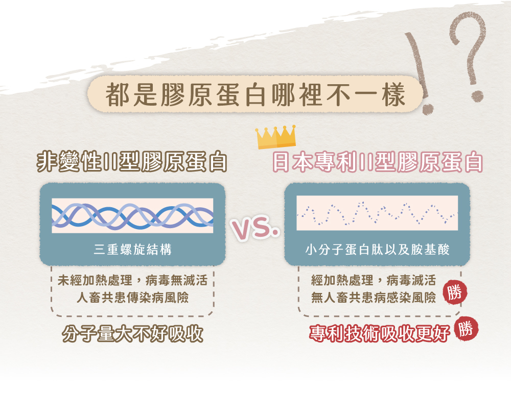 雖然它們都是膠原蛋白,兩者還是不同的喔! 優彈力使用的日本專利II型膠原蛋白主要為小分子的蛋白胜肽,UCII則為分子較大、未分解的三股螺旋結構。雖然切割後的II型膠原蛋白比UCII需要更多的劑量,但是小分子的特性更好吸收! |