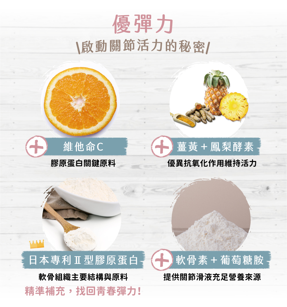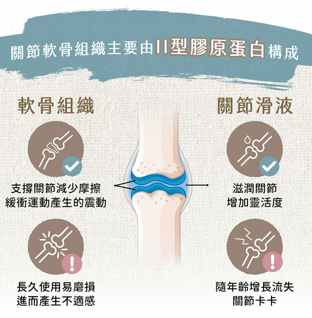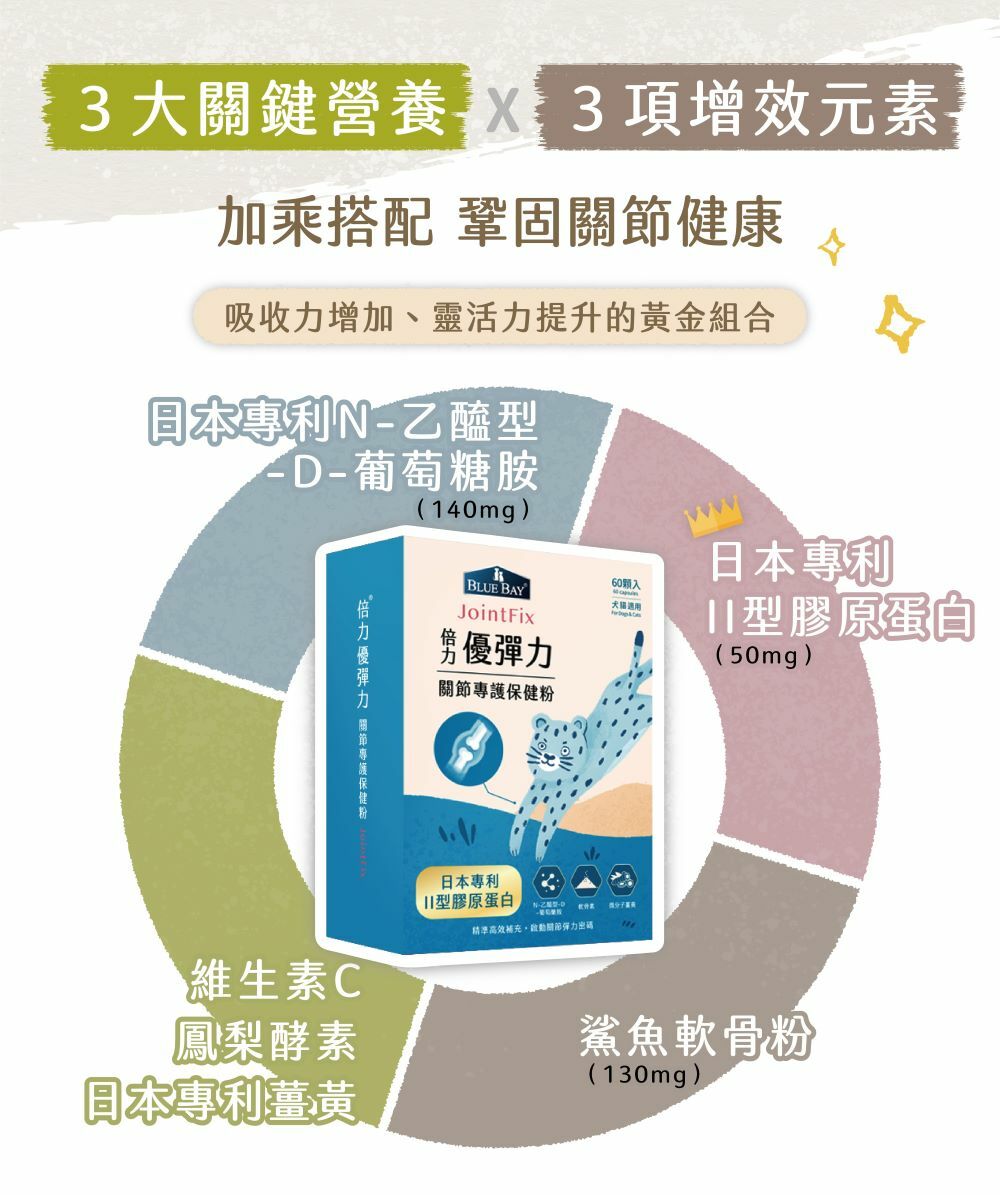 三大關鍵營養:日本專利二型膠原蛋白、日本專利YKS N-乙醯型-D-葡萄糖胺、軟骨素。