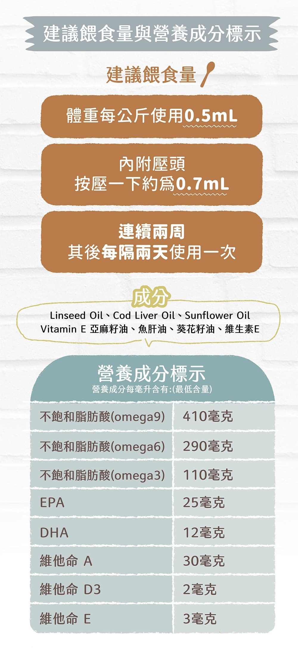 澳洲歐美膚富含高單位天然亞麻籽萃取油,Omega-3不飽和脂肪酸能幫助呵護動物健康皮膚和皮毛。搭配維他命A、D3、E等營養素,營養補充擁有完美亮毛。獨特清新香氣,適量加入飼料中可增添風味,增進犬貓食慾,且容易吸收,是寵物平日最佳營養補品。